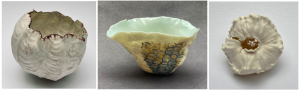 There were eight of us and Jess taught us how to cast natural objects in slip which created some beautiful results from objects such as leaves, poppy seeds and bark. We then tried slab building using textures for imprinting and colour addition using oxides and stains which produced fascinating unpredictable colours.