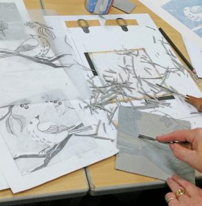 In November we were delighted to invite back to our studio Lisa Takahashi to show us how to make linocut prints using the reduction technique. With Lisa’s materials and excellent tuition, we were really pleased with the resulting prints. Didn’t we do well?