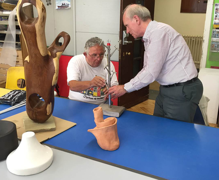 David reported back to say he had “great fun running a touch tour at Southampton Civic Centre Art Gallery workroom for five blind adults from a group that meets bimonthly there. I took 9 pieces (two early constructivist, a very early ceramic, thrown plaster white king and cast cement black queen cement fondue chess pieces and four biomorphic abstract wood sculptures scented with different aromatic oils). We sat the assembled company around a large table and slid the pieces. I was amazed by the ability to reconstruct three dimensional objects in the subjects mind and to detect the difference between heart wood and surface wood . The level of concentration was amazing. All liked the wooden pieces. The constructivist pieces went down less well but provoked an interesting discussion in the role of the Russian revolution in starting constructivism and the latter’s impact on Bau Haus architecture and furnishings! The retired maths teacher detected the spiral (Fibonacci) arrangement of leaves in my hammer and nail plant piece! The group are keen to come to the barn to do more hands on work including clay. Altogether a very moving experience for me”.
